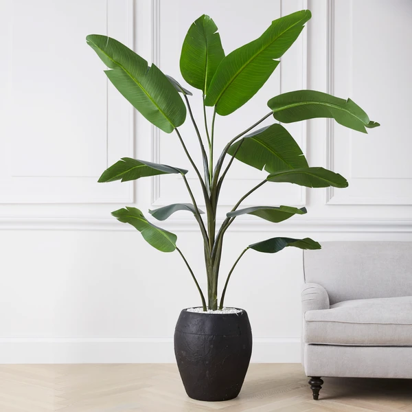 Housed in a black pot, this lifelike banana palm plant brings a splash tropical flair to the scene.