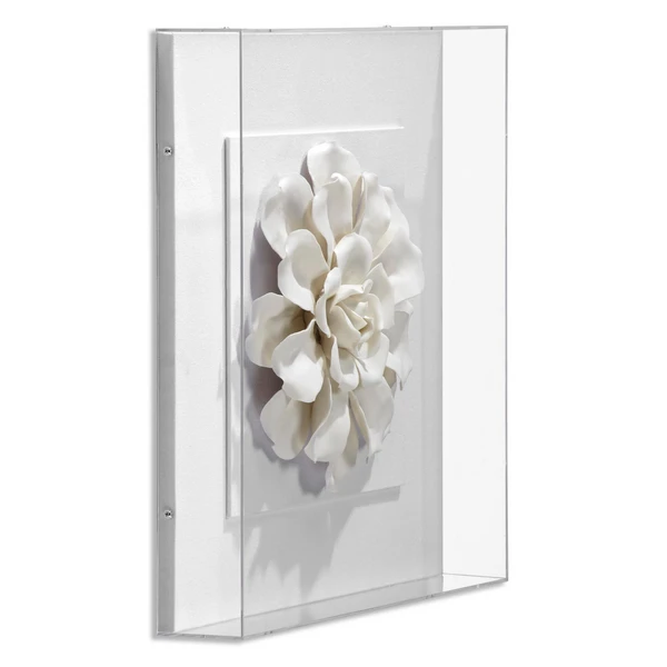 - Flower sculpture on linen backing set in an acrylic shadowbox.