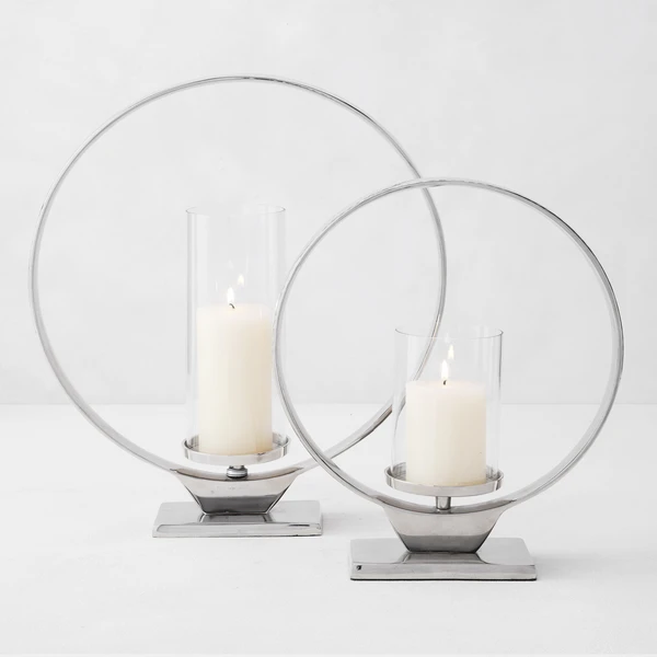 Clean contemporary styling makes our Cirque pillar holders an essential ingredient for modern decor. Crafted of polished Silver metal with a sleek sensibility, each pillar holders is encircled by a wide band of textural hammered metal which surrounds the elevated pedestal stand. A circular metal plate holds a glass sleeve to protect the flame of a standard pillar candle. Available in two sizes to assemble a pair or grouping.