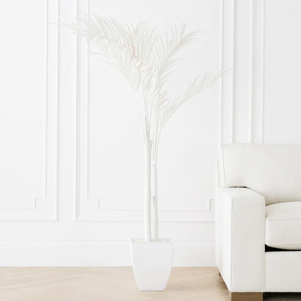 Six feet high faux palm tree makes an over-the-top glam statement in bright white.