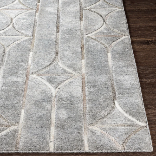 Soft underfoot, this rug is handcrafted of silky viscose with strips of hair-on hide arranged in an eye-catching geometric pattern.