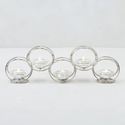 Diamond-shaped glass votive holders are encircled by linking silver rings to create a mod centerpiece that feels both dazzling and dynamic.
