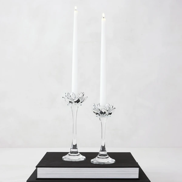 Give your evening a glam glow. This taper candle holder features an intricately faceted glass lotus at its base for eye-catching candlelight that dances the night away. Sold separately.