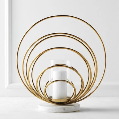 A stunning addition to any decor, this pillar holder features a clear glass vessel encased in a dome of concentric rings. A marble base beautifully complements the gleaming gold finish.