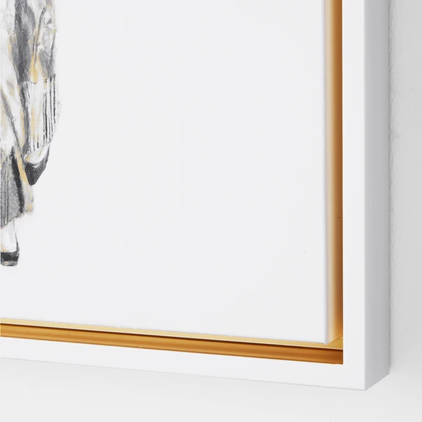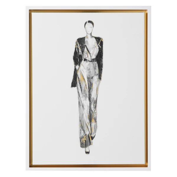 Small-scale in stature, but big on style, the On The Runway Series makes a fashion statement for sure. Each piece is created using giclee on canvas with a hand-applied image brush gel finish. They are framed in white floater frames with gold inner framing. On The Runway X is #1 of 4 in a series.