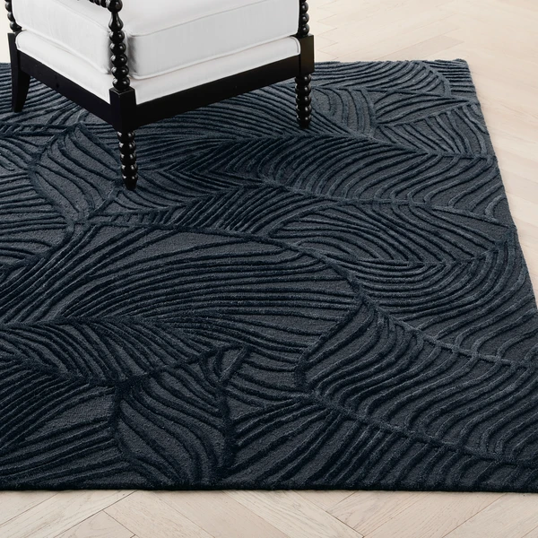 Tiptoe through the texture! Our Palm Rug adds visual interest as well as simple sophistication to any space. Rendered in a charcoal palette, this rug shows off a dynamic palm-leaf design with a high-low pile that adds texture and aesthetic appeal to your room.