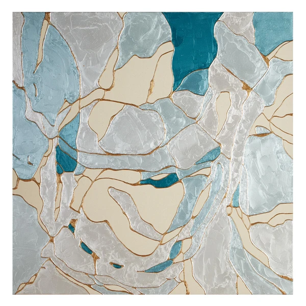 Featuring an organic, mosaic-like design in cool hues, this original work from artist Beverly Fuller is painted on canvas with a beautifully textural finish.