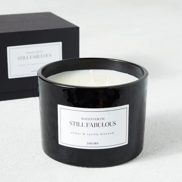 Presented in a black glass vessel with a tonal leopard print and sassy saying, this triple-wick candle features a warm amber and vanilla blossom scent and arrives in a handsome box, ready for gifting.